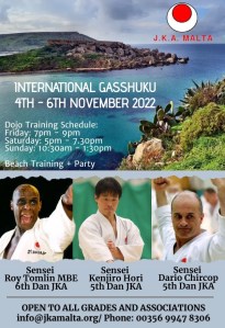 Friday 8th – Sunday 10th November – JKA Malta Gasshuku with Sensei Roy Tomlin MBE, Sensei Ken Hori and Sensei Dario Chircop 5th Dan (JKA Malta)