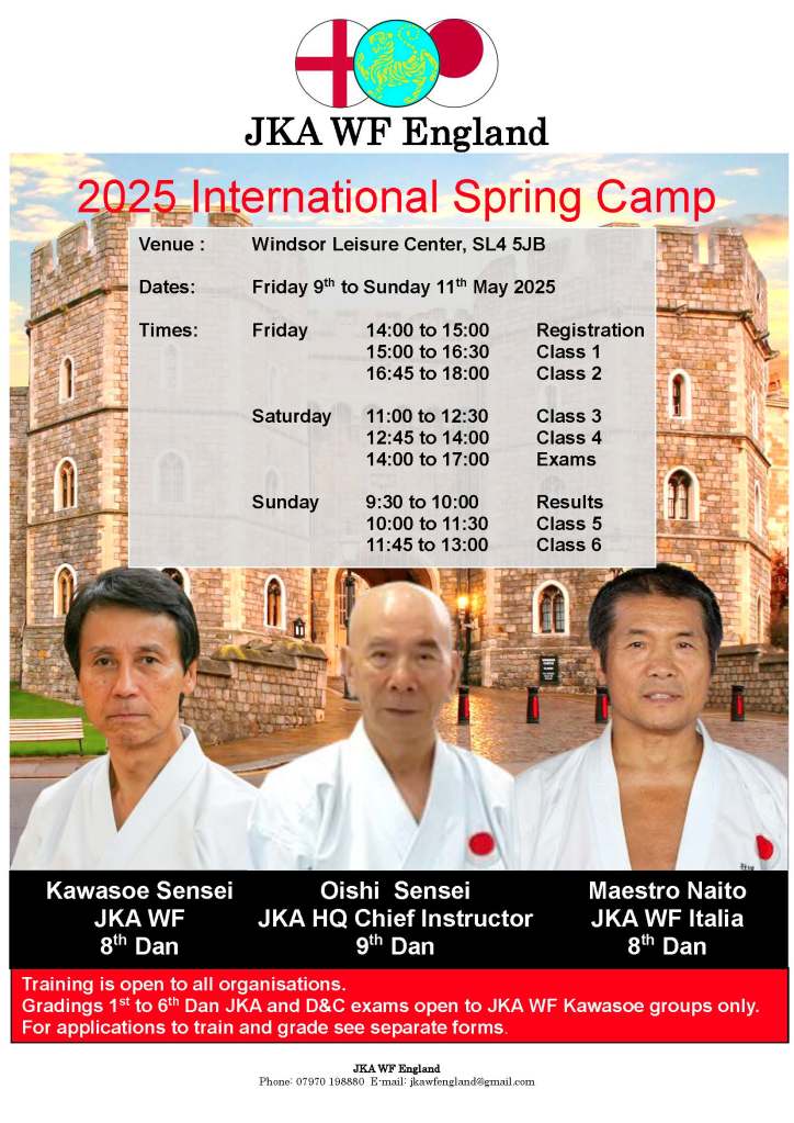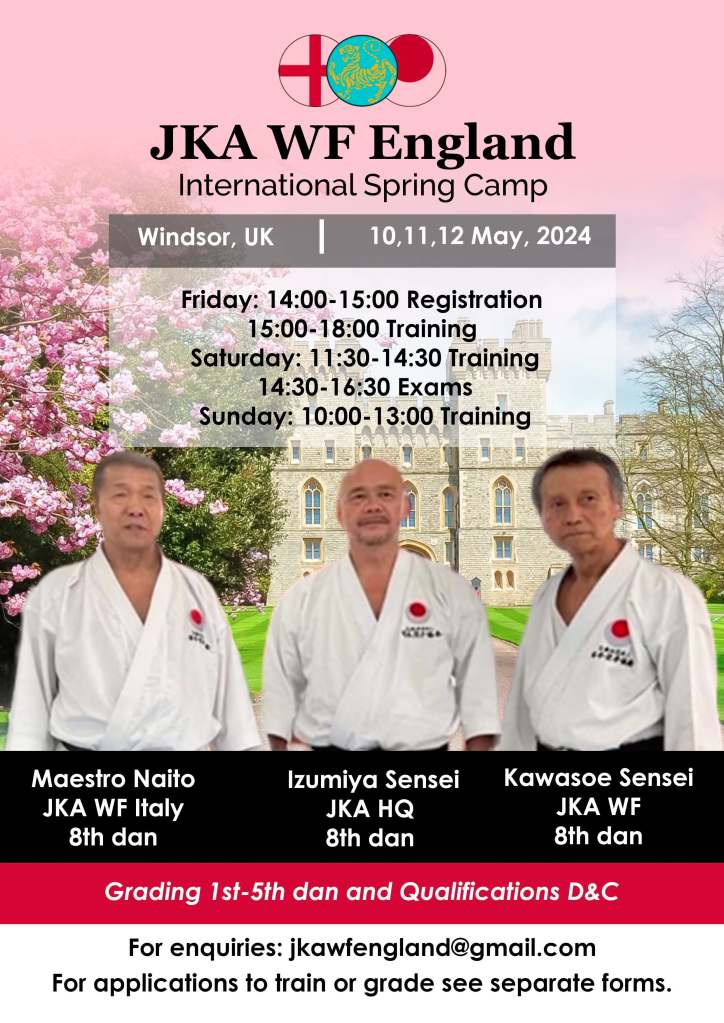 Friday 9th – Sunday 11th May – JKA WF England Spring Gasshuku at Windsor Leisure Centre with Oishi Shuseki Shihan (Honbu Dojo) and Kawasoe Sensei.