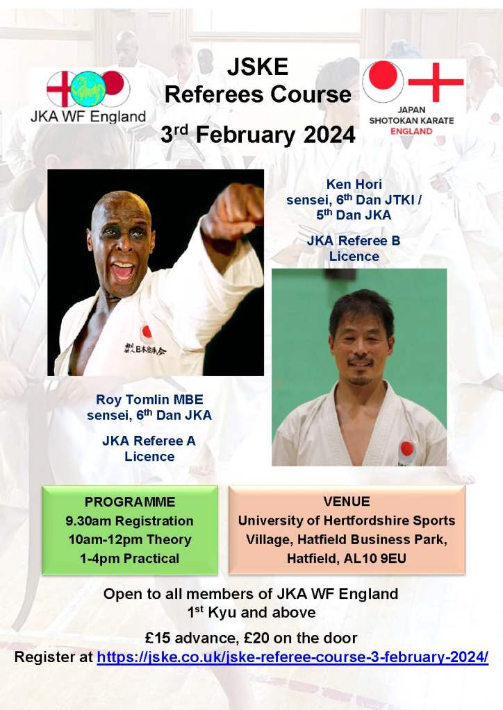 Saturday 3rd February – JKA WF England Referees Course organised by JSKE at University of Hertfordshire Sports Village. Register here.