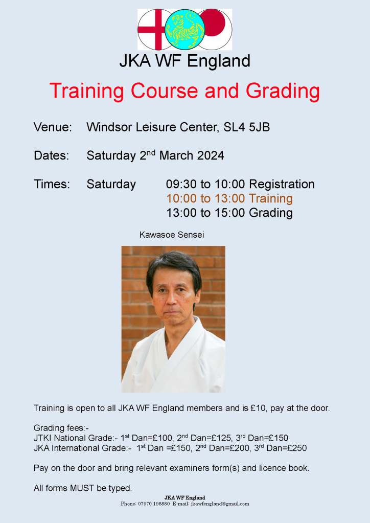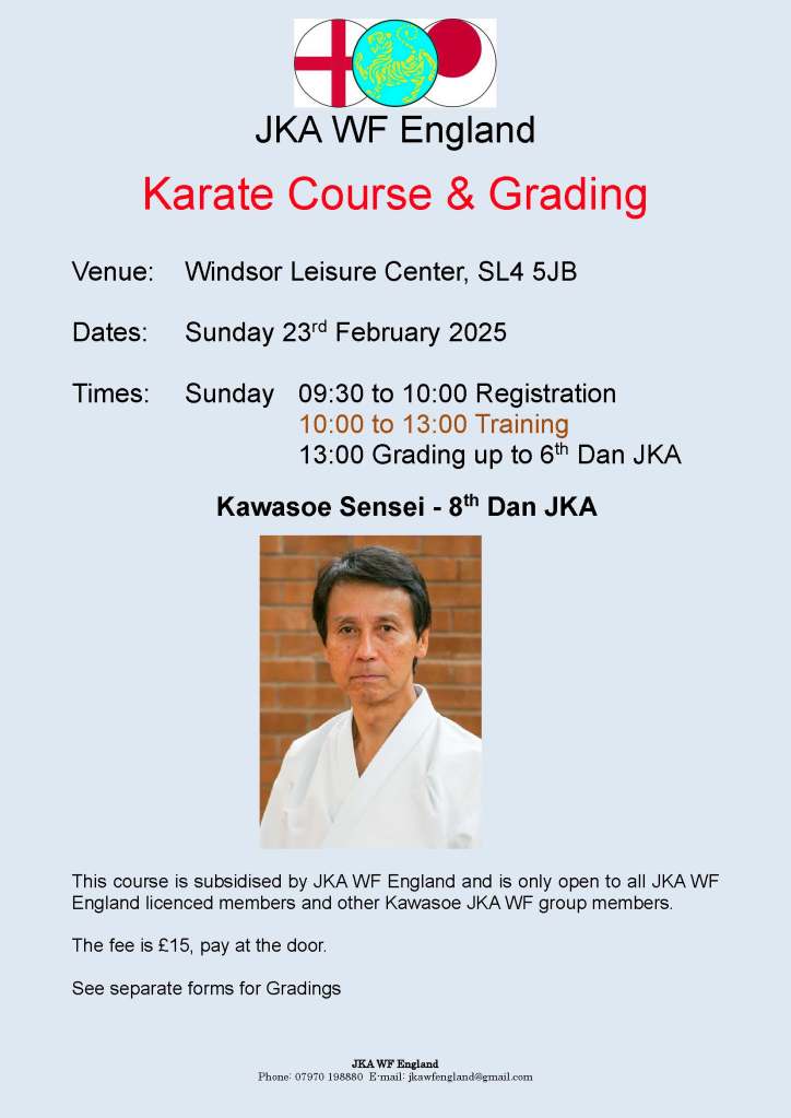 Sunday 2nd November – JKA WF England Black and Brown Belt Course with Sensei Kawazoe at Windsor Leisure Centre with referees course, grading and qualification exams