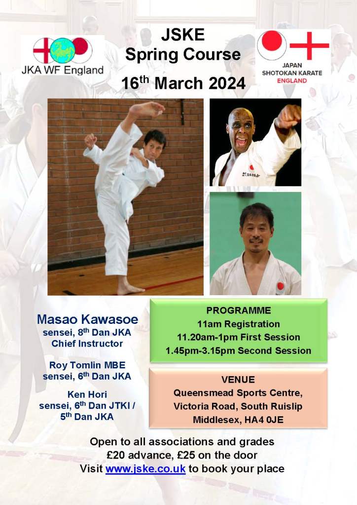 Saturday 16th March – 3rd JSKE Spring Course with Sensei Kawasoe, Sensei Roy Tomlin MBE and Sensei Ken at Queensmead Sports Centre