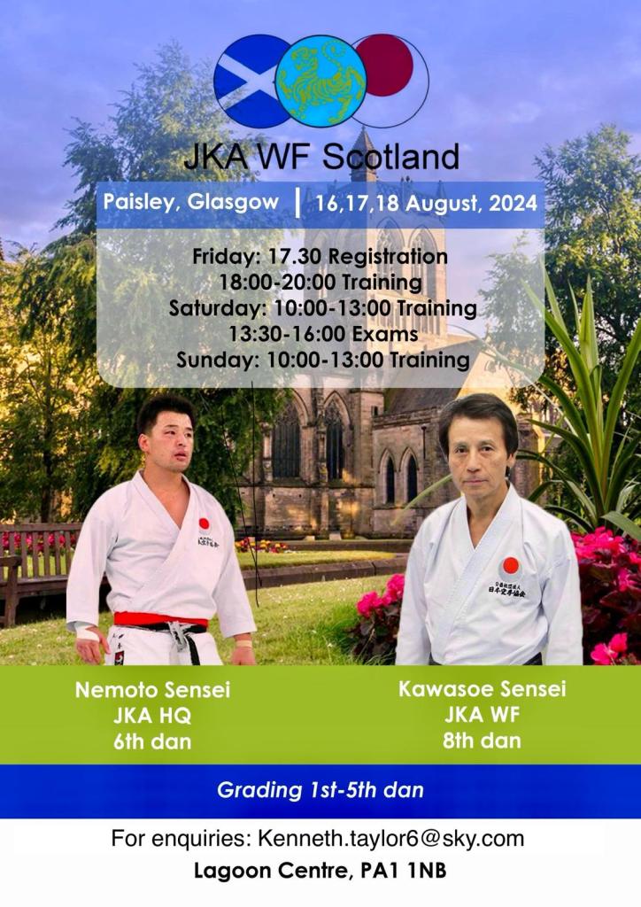 Friday 16th – Sunday 18th August – JKA WF Scotland Spring Gasshuku at Lagoon Leisure Centre, Paisley, Scotland with Kawasoe Sensei & Nemoto Sensei (Honbu Dojo)